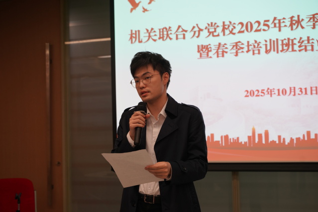 在学员代表发言环节,来自春季培训班的学员代表黄平、张锦骁(建筑设计院发展对象)、金朋玮(机关党委积极分子)和宋佳音(出版社积极分子)分享了他们的学习心得与收获,表达了将继续努力、不断进步的决心。随后,秋季培训班学员代表王巧影(机关党委积极分子)、施小露(后勤集团积极分子)、忻晟熙(规划院积极分子)作了表态发言,展现了新学员积极向上的精神风貌和潜心学习的坚定态度。