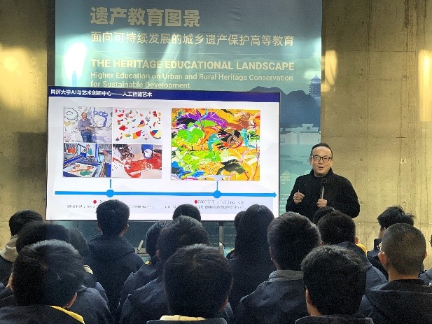 而后同学们来到同济大学建筑与城市规划学院人工智能与艺术创研中心,人工智能艺术研究专家于幸泽教授携其博士生团队,为同学们带来了一场别开生面的学术分享。于教授以AI遇见艺术为主题,深入浅出地讲解了人工智能在绘画、音乐、设计等艺术领域的创新应用,并现场展示了AI生成的艺术作品。讲座中,同学们积极互动,围绕“AI是否具备创造力”“人工智能是否会取代艺术家等话题开了热烈交流。